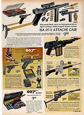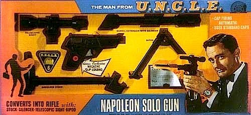 The “Secret Agent set” from HG Toys is the U.N.C.L.E. gun we should have had. This unauthorized knockoff, marketed a decade after the series went off the air (seen here in the 1979 Montgomery Ward Christmas catalogue), was part of a whole range of “Ultra Force 1” gun sets made by HG. The secret agent set featured nice replicas of a standard P-38 and the Bushnell Phantom scope used on the real U.N.C.L.E. Special. And unlike Ideal’s gun, HG included an “extended magazine” that clipped on the pistol butt, mimicking the double-length magazine of the real Special. There was, unfortunately, no barrel extension, only that long, wicked-looking silencer.